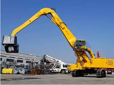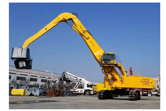 該設備分別采用了大功率“國三”標準發(fā)動機、380V 西門子電機,以及全套采用施耐德控制系統(tǒng)拖動控制兩套力士樂液壓動力機構(gòu)及先導液力控制的世界首臺“雙動力”抓料機。該機設計了寬體結(jié)構(gòu)梁,以及加強型可更換正、負差的二節(jié)式作業(yè)主臂,最大吊重量達 25 噸、最大作業(yè)半徑為 18米。在 5 至 12 米作業(yè)半徑內(nèi),可配備 5.0 立方蚌殼抓斗,或 2.5 立方梅花廢鋼抓斗。